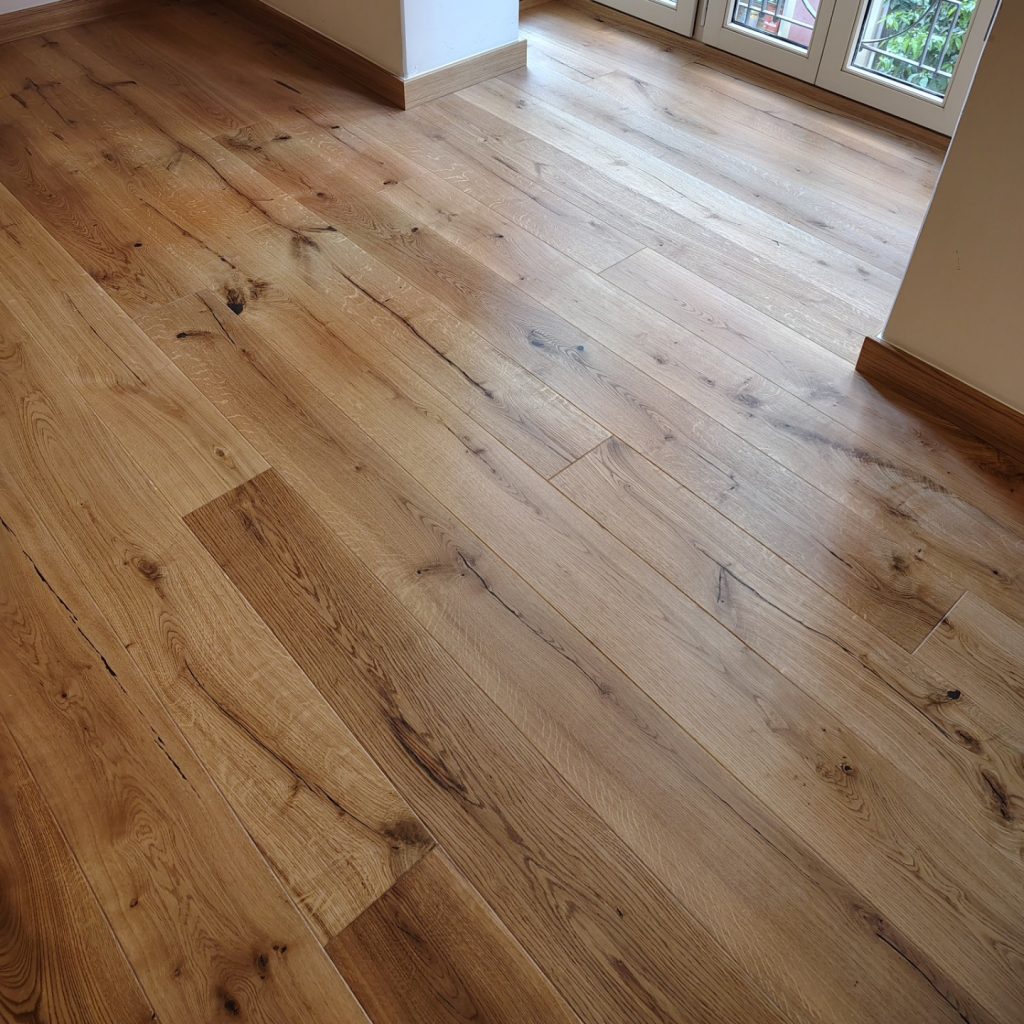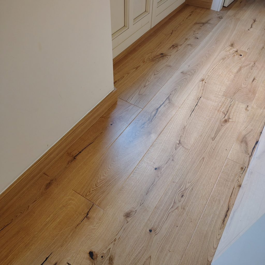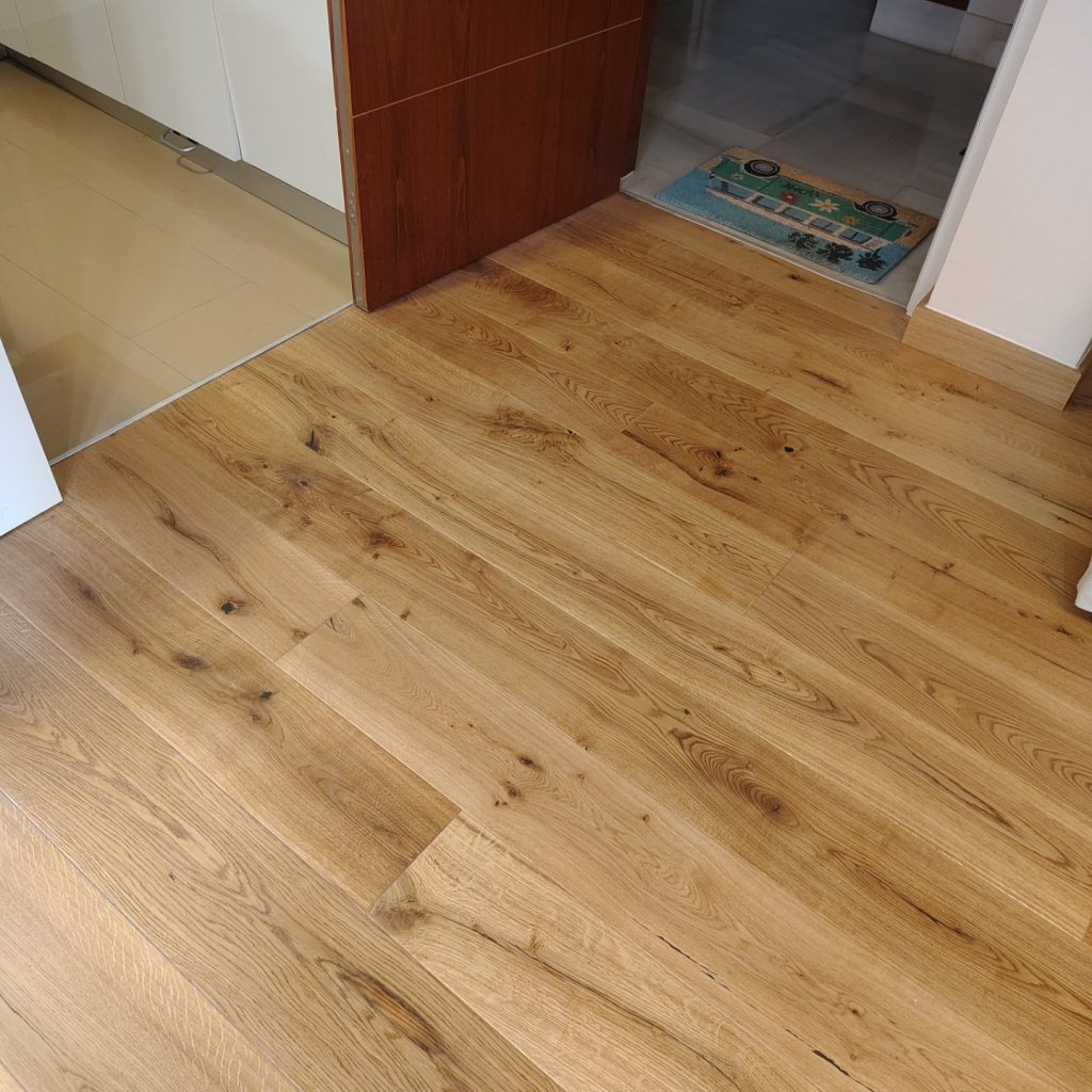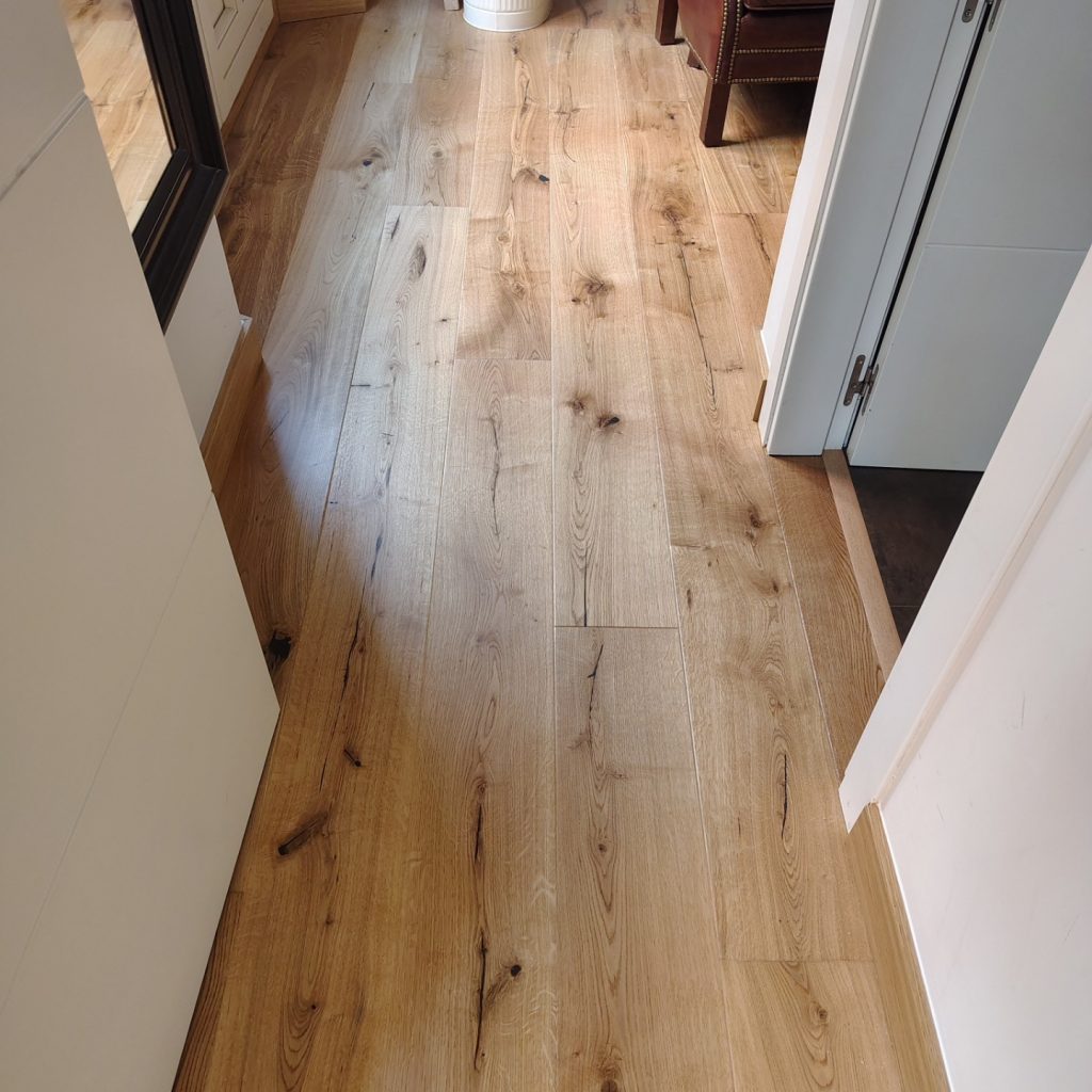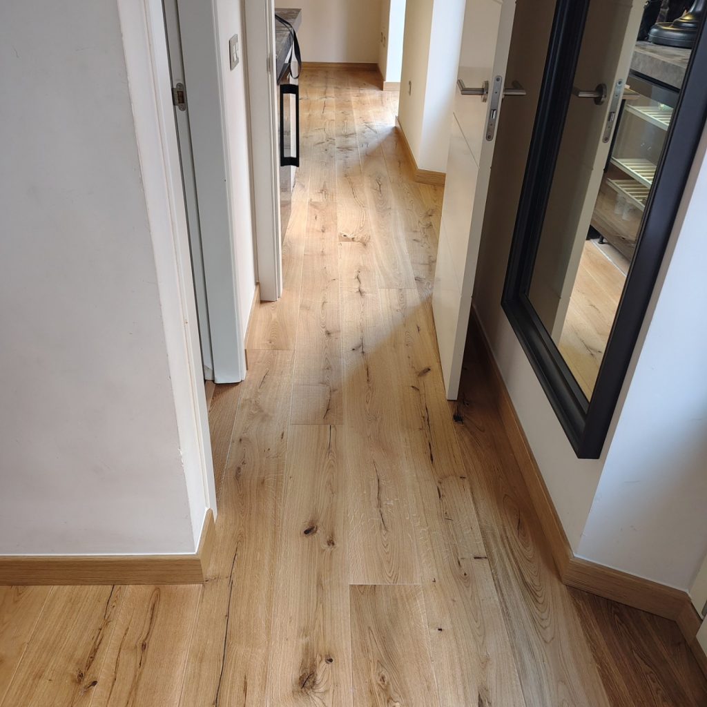 Hemos finalizado con éxito la instalación de un elegante suelo de tarima multicapa de roble en 1 lama con sistema de anclaje en click y biselado, proporcionando a este piso un acabado sofisticado y natural. La elección de este suelo no solo aporta calidez y confort, sino que también realza la amplitud y luminosidad de cada estancia, creando un ambiente acogedor y armonioso. Además, hemos instalado rodapiés rechapados a juego, de 10 cm de altura, que complementan a la perfección la estética del suelo, dando continuidad y un acabado impecable a toda la vivienda. Gracias a la calidad de los materiales y la precisión en la instalación, el resultado es un suelo duradero, resistente y con un diseño atemporal que encaja a la perfección con cualquier estilo decorativo. El cambio ha sido espectacular, transformando por completo la apariencia del hogar y otorgándole un aire renovado y elegante. Nos enorgullece haber formado parte de este proyecto y ver la satisfacción de nuestros clientes con el resultado final.